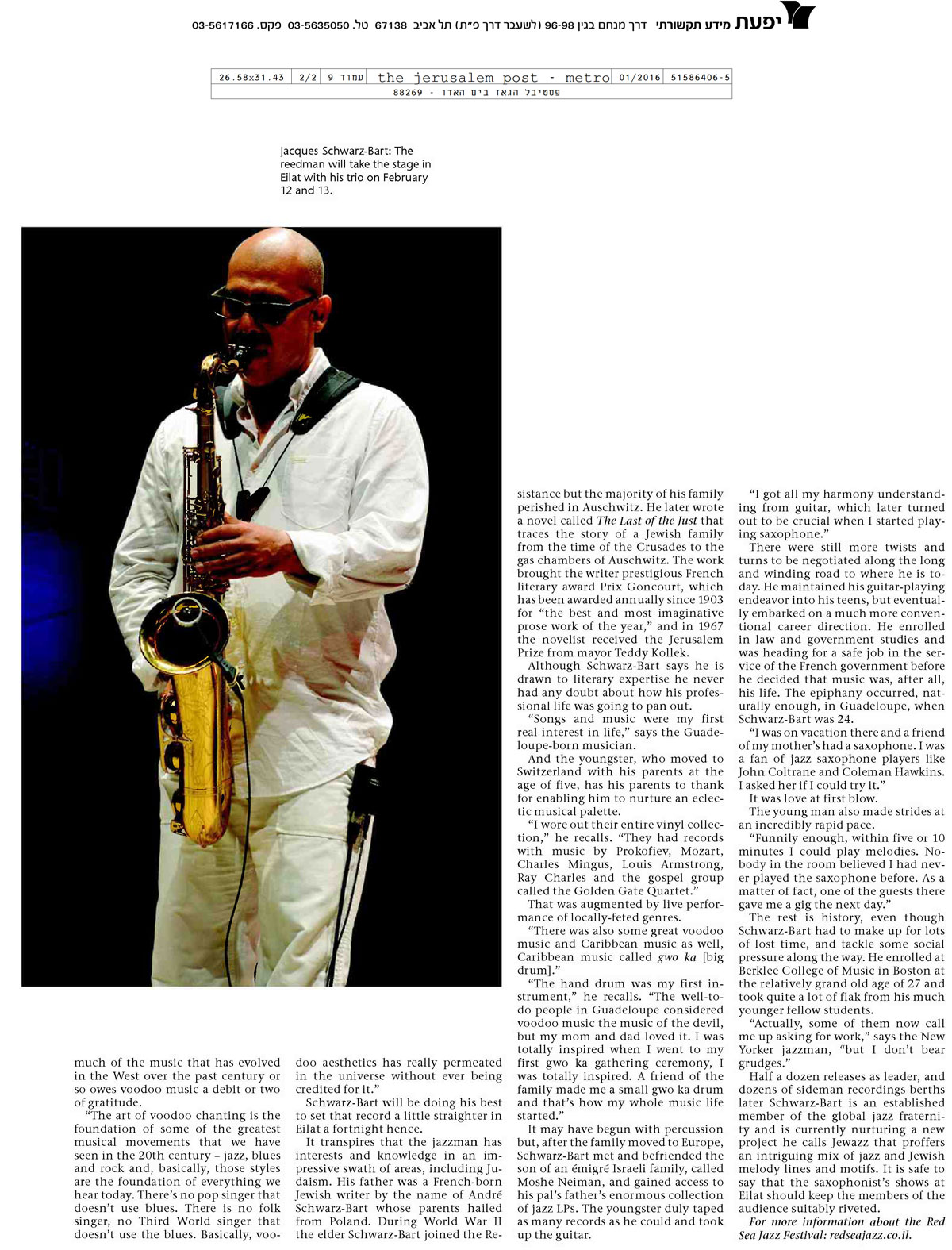 Run your eye down the list of acts lined up for the forthcoming winter edition of the Red Sea Jazz Festival (February 11-13) and besides the great Art Shop that will be present you may very well stop, if not balk, on one name in particular. Jacques Schwarz-Bart is pretty impressive moniker in itself, with seemingly manifold cultural derivations, but it is the description of his artistic enterprise that is the real attention grabber.